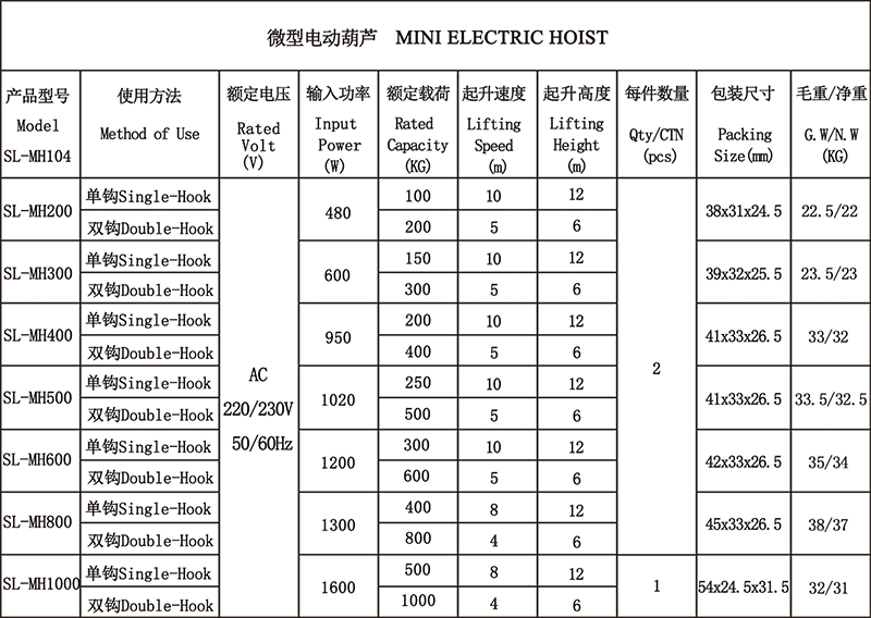 1、微型电动葫芦设计灵巧,使用方便。 2、当上升的重物喷到限位器时,提升机会自动停止作业。 3、如钢丝绳反向提升,提升机马达会自动停止工作。 4、提升机上钩设计分为动态装货
